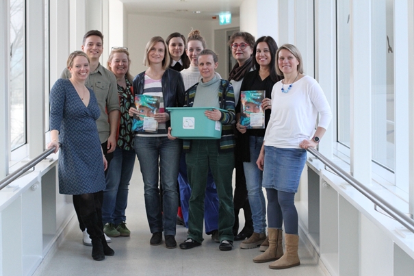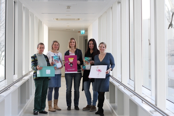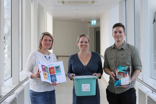 Das Education & Care in RARE Team mit den entwickelten Arbeitsmaterialien: Education & Care in RARE Arbeitsbuch für Kinder und Jugendliche, Manual für Anwender:innen und Aktivitätsbox.